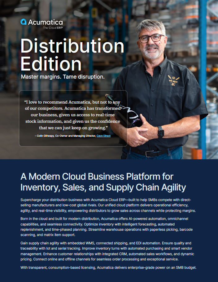 Supercharge your distribution business with Acumatica Cloud ERP—built to help SMBs compete with direct selling manufacturers and low-cost global rivals. Our unified cloud platform delivers operational efficiency, agility, and real-time visibility, empowering distributors to grow sales across channels while protecting margins.